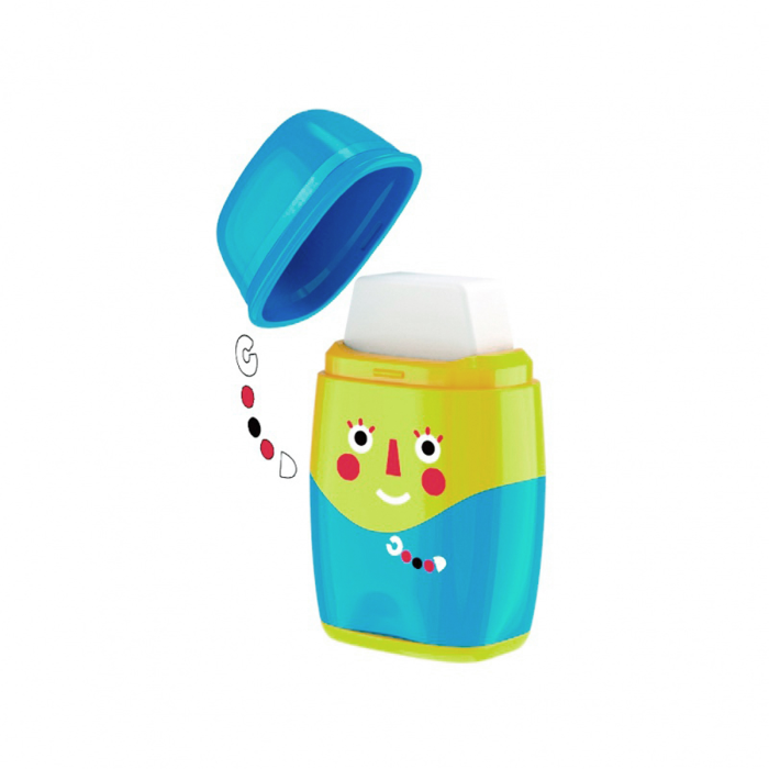 Plastové strúhadlo Keyroad 2 v 1 s gumou, s dvomi otvormi na ceruzky/pastelky s priemerom 8 a 11 mm a s nádobou. Balenie: blister. Farba: mix farieb.