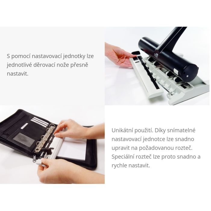 Ručná dierovačka, vybavená štyrmi posuvnými dierovacími hlavami s variabilným nastavením ľubovoľnej kombinácie dierovania a aretáciou horného dielu na ľahké uloženie. Možnosť dokúpenia páru ďalších dierovacích hláv na predierovanie maximálneho počtu 6 otvorov (6mm), obj.kód NO250478. Hmotnosť 2280 g. Záruka 10 rokov.