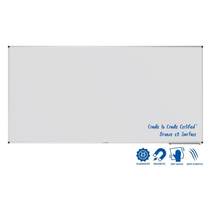 Robustná a udržateľná tabuľa na časté používanie v kancelárii, triede alebo v priemyselnom prostredí. Vhodná na písanie fixkami na tabuľu stierateľnými za sucha. Magnetický smaltovaný oceľový povrch s použitím e3 Ceramic Steel, ktorá má certifikáciu Cradle to Cradle Certified™ na úrovni bronzu. Hliníkový rám so sivými plastovými rohovými krytkami (Pantone 433C). Možno namontovať horizontálne alebo vertikálne. Vrátane držiaka popisovačov (30 cm), montážnej sady a montážneho návodu. Rozmery: 120 x 200 cm.