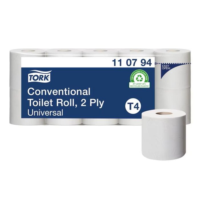 Tork toaletný papier konvenčný kotúč Universal spĺňa základné potreby a zároveň ponúka dobrú kvalitu pre toalety a umyvárne s malou návštevnosťou. Dĺžka kotúča: 32,5 m Šírka kotúča: 9,40 cm Priemer kotúča: 12 cm Vnútorný priemer dutinky: 4 cm Počet útržkov: 250 Dĺžka útržku: 13 cm Počet vrstiev: 2