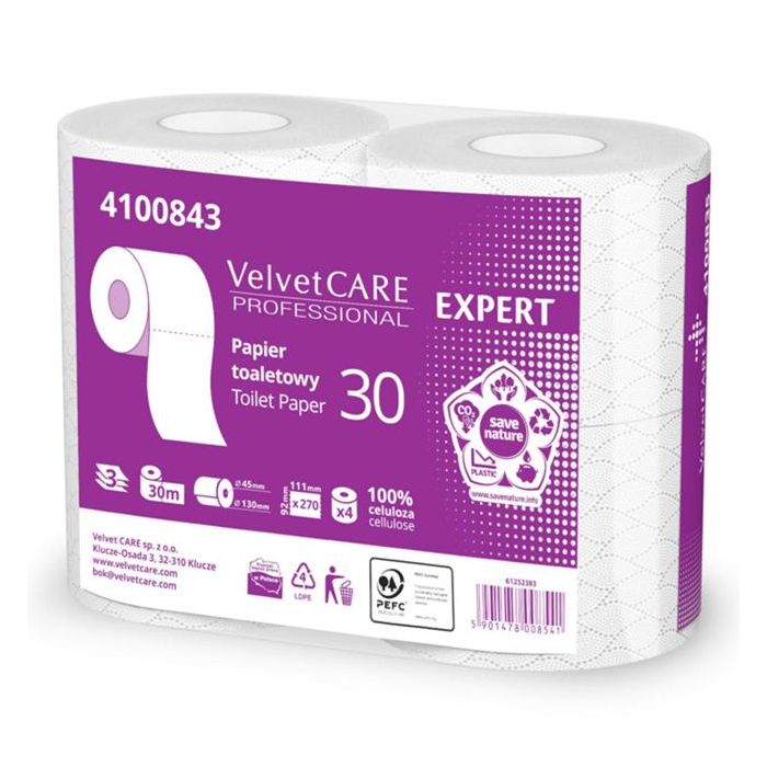 Extra jemný 3-vrstvový toaletný papier Velvet CARE Professional Expert s návinom 30 metrov a s 270 útržkami v jednej rolke. 4 rolky v balení, 100 % celulóza.