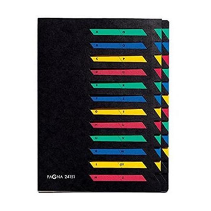 12-dielna stolová triediaca kniha Pagna z pevného hladeného kartónu gramáže 450 g na číselné triedenie. Farba vrchného obalu čierna. Otvory na titulnej strane na popis jednotlivých oddielov, jednotlivé oddiely farebne rozlíšené, rýchle otvorenie príslušného oddielu vďaka bočnému výseku, rozťahovateľný chrbát s veľkou kapacitou jednotlivých oddielov.