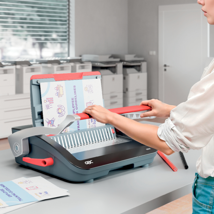 • spoľahlivý a kompaktný ručný viazač s plastovými chrbtami, navrhnutý na zdieľané použitie v kancelárskom a školskom prostredí s bežnými nárokmi na objem väzby