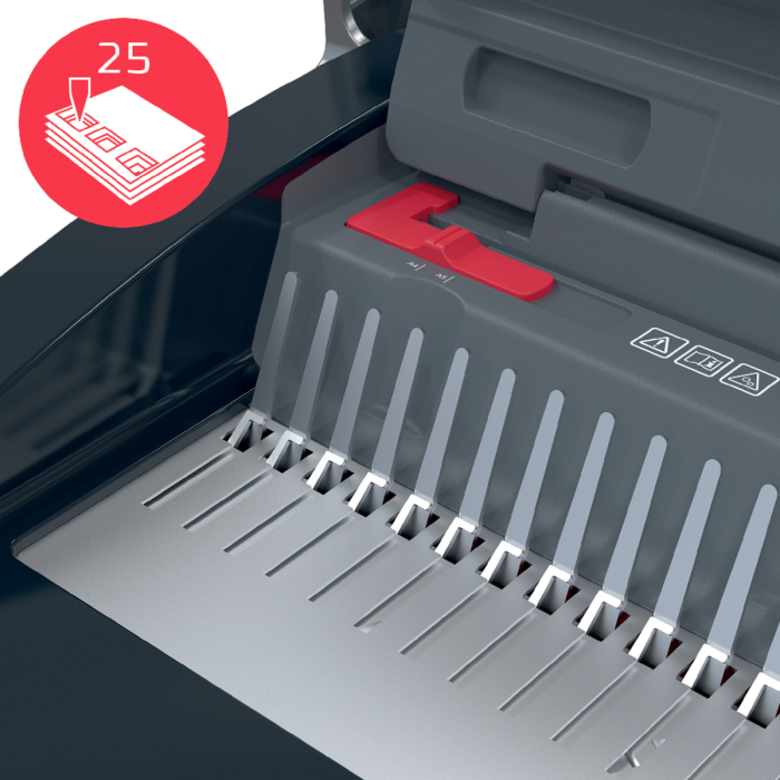 • presekne až 25 listov papiera s gramážou 80 g/m² formátu A5/A4 naraz a efektívne zviaže až 390 listov naraz pomocou 45 mm chrbtov
