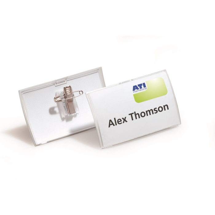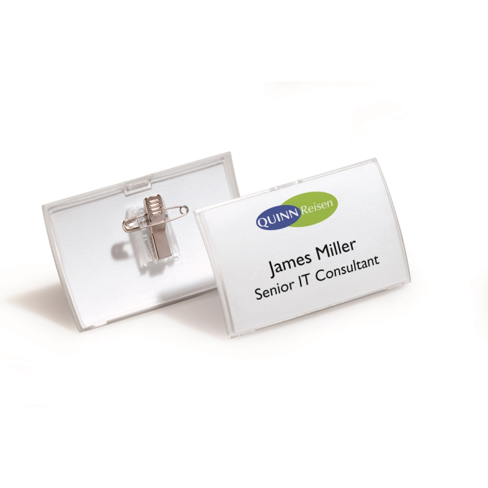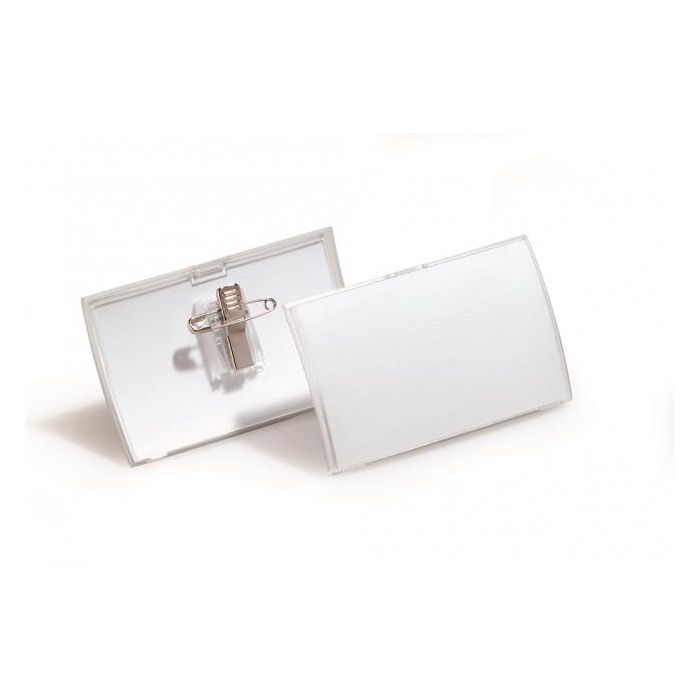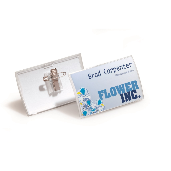 Elegantné visačky z pružného plastu s matným povrchom a horizontálnym zaoblením. Uchytenie na zadnej strane štipcom alebo zatváracím špendlíkom. Náhradné papieriky obj. kód DU145502. Rozmer 90x54 mm. Balenie 25 ks.