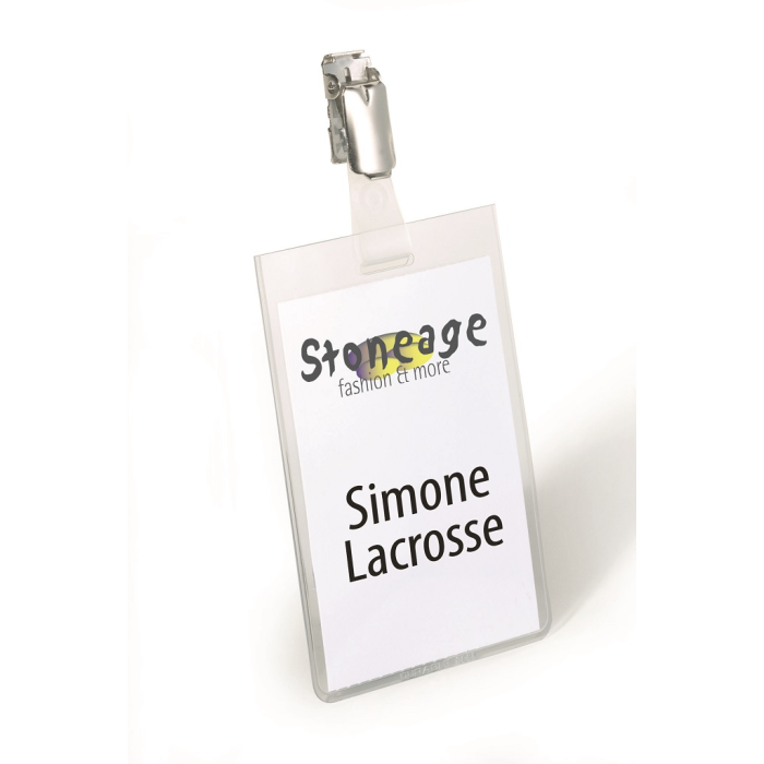 Priehľadná visačka s európskym štipcom, umiestneným na kratšej strane visačky. Dodávaná s papierovou kartičkou rozmerov 90×60 mm. Model, pri ktorom po uzavretí štipca nie je možné menovku vybrať. Náhradné papieriky obj. kód DU145702. Balenie 25 ks.