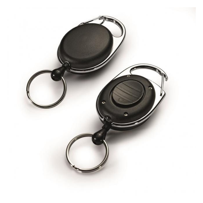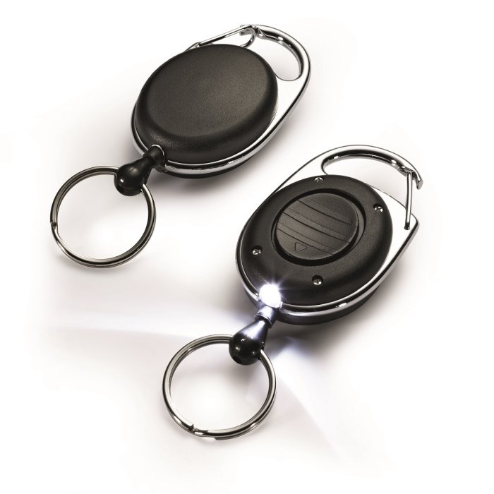 Štýlový kotúč s oválnym plastovým telom a kovovým klipom s kľúčovým krúžkom a Led svetlom na orientáciu v tme. Vysunutie kotúča do dĺžky 80 cm. Vhodný na uchytenie všetkých visačiek značky DURABLE s perforáciou.