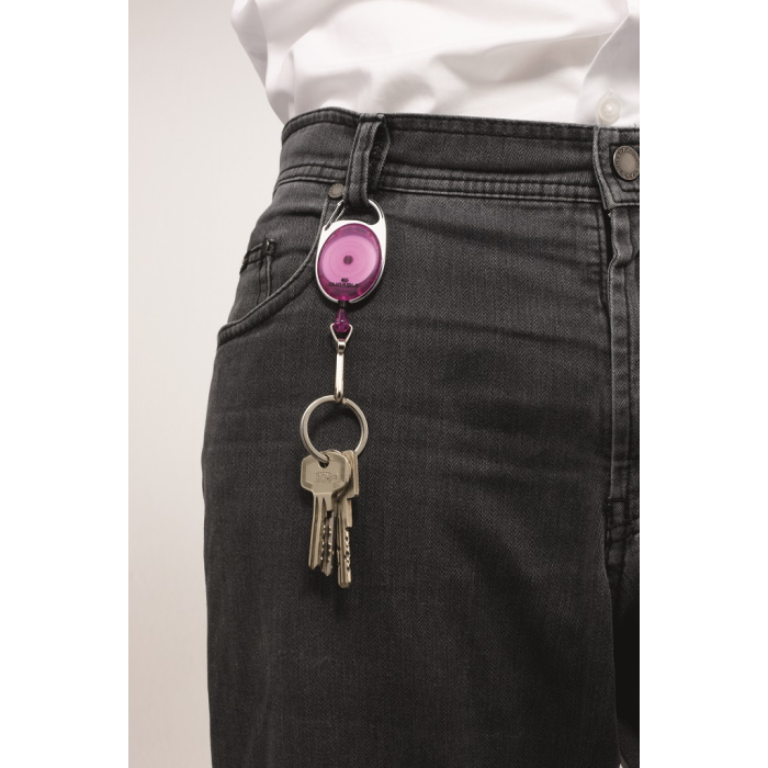 Štýlový kotúč s oválnym farebným telom a kovovým klipom so svorkou poskytuje rýchlu a jednoduchú manipuláciu s visačkou, príp.kartou. Vysunutie kotúča do dĺžky 80 cm. Dodávaný bez visačky. Farba svetlofialová.