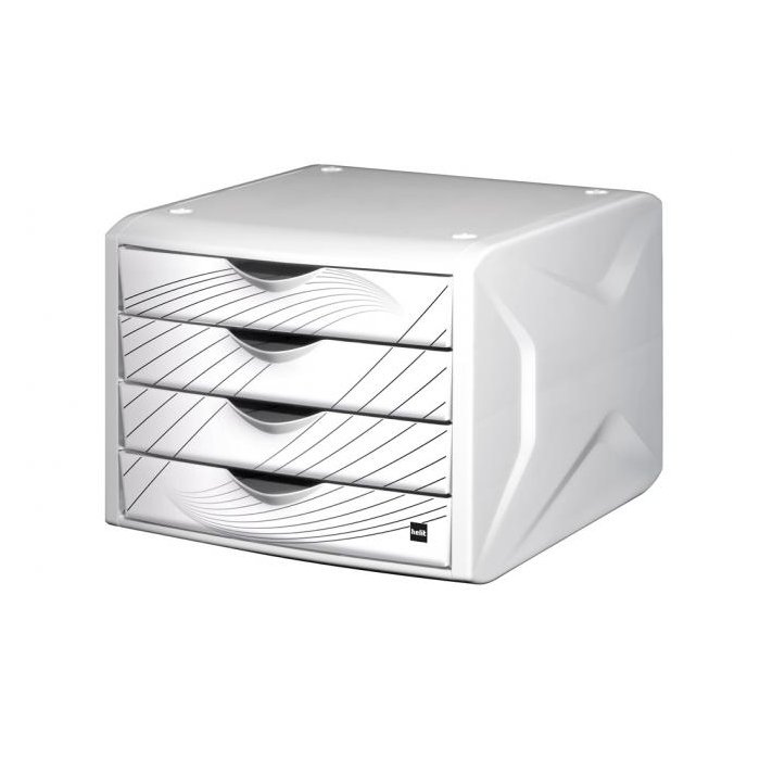 Stohovateľný box z odolného polypropylénu so štyrmi zatvorenými zásuvkami a dekoráciou na prednej strane zásuviek. Svieži dizajn. Rozmery (š × v × h) 262 × 212 × 330 mm.