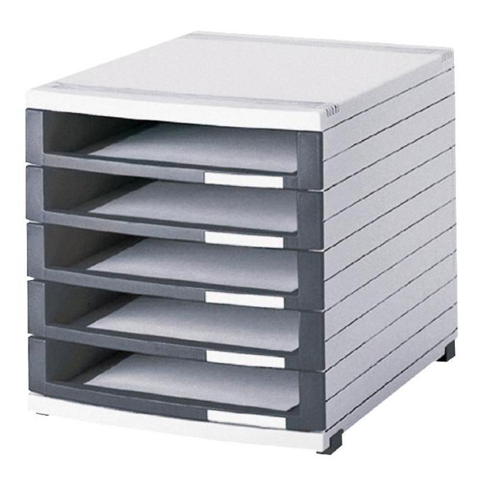 Box z modulárneho systému zásuvkových boxov s horizontálnym aj vertikálnym spájaním. Model s otvorenými zásuvkami (bez predného krytu) výšky 50 mm a zarážkou chrániacou zásuvky pred úplným vysunutím. Súčasťou sú identifikačné menovky na označenie zásuviek.Telo boxov vo svetlosivej farbe, zásuvky tmavosivé. Rozmery (š × v × h) 30 × 30,7 × 38,2 cm.