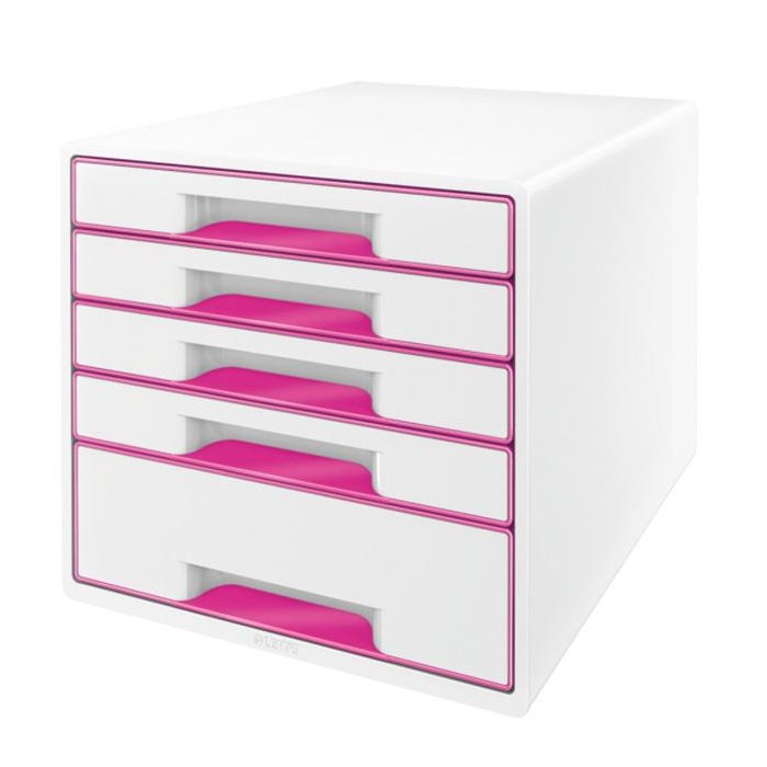 Box, dopĺňajúci produktovú radu Leitz WOW. Ľahko vysúvateľné 4 malé a 1 veľká zásuvka so zarážkou proti úplnému vysunutiu, jednoduché otváranie a zatváranie. Gumové nožičky pre lepšiu stabilitu, rozlišovač na popis zásuvky. Rozmery 287 × 270 × 363 mm.