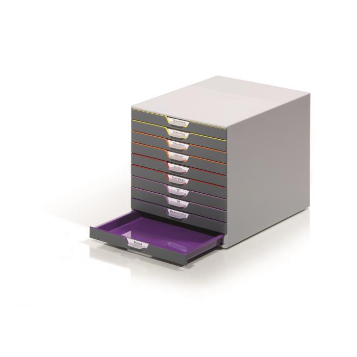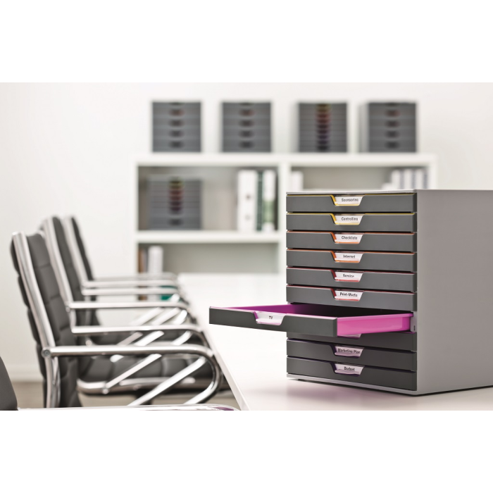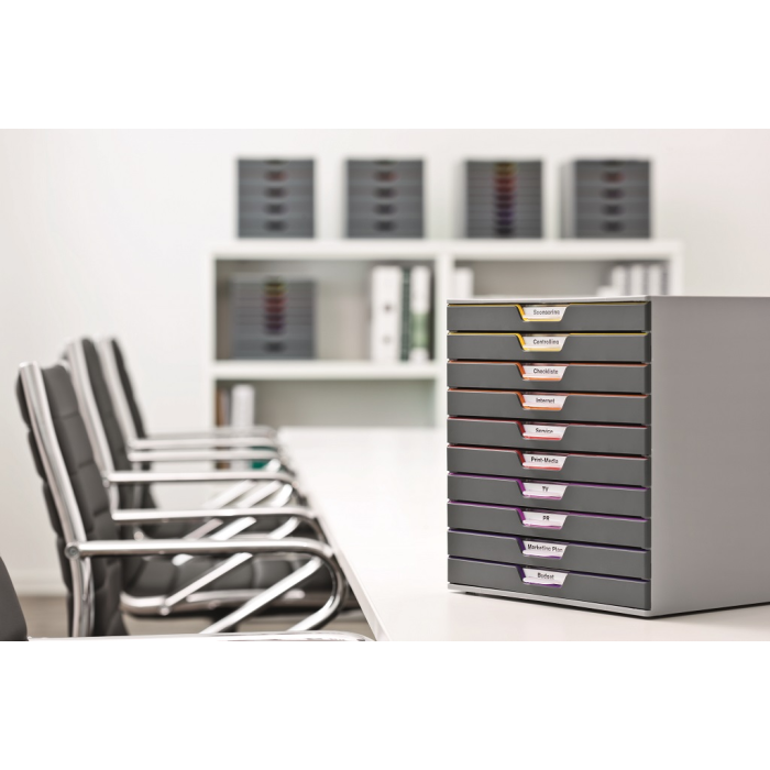 Boxy s 10 zásuvkami s vnútrami dúhových farieb dodajú kancelárii nádych elegancie. Pri ich zatvorení farebné línie iba jemne vystupujú z elegantnej sivej farby, pri otvorení sú žiarivé farby dúhy potešením pre oči. Dodávané s priehľadnými plastovými indexami na označenie obsahu. Boxy sú stohovateľné, zásuvky zabezpečené proti vypadnutiu. Materiál najkvalitnejší ABS plast, tichý a ľahký posun zásuviek, spodná strana s protišmykovou ochranou. Víťaz Product design award 2013. Rozmery (š × v × h) 292 × 280 × 356 mm.