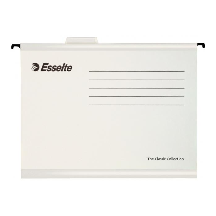 Závesné obaly Esselte kolekcie Classic vyrobené z pevného kartónu. Lisované dno obalu dovoľuje zvýšiť kapacitu na 30 mm. Súčasťou obalu je násuvný index z priehľadného plastu s výmenným papierovým štítkom. Formát A4, rozpätie vodiacich líšt 330 mm. Farba: biela Balenie: 25 ks