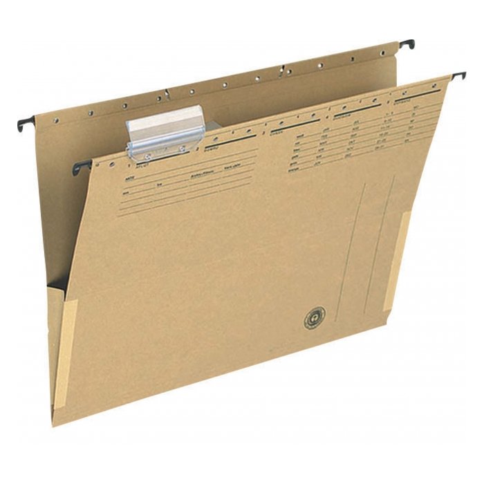 Závesné obaly z recyklovaného papiera gramáže 230 g na dokumenty formátu A4 s bočnicami. Súčasťou obalov je násuvný index z priehľadného plastu s výmenným papierovým štítkom. Farba prírodná hnedá. Väčšie balenie 25 ks.