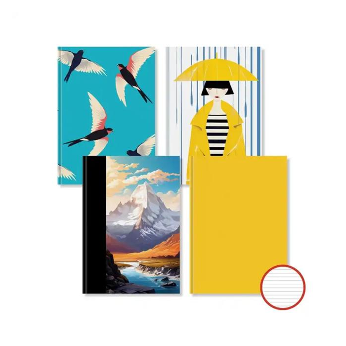 Záznamová kniha s bezdrevným papierom v pevnej väzbe s lesklou lamináciou, dodávané v mixe motívov.