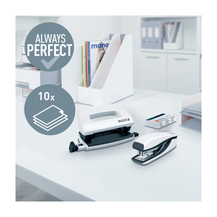 Malá zošívačka v moderných žiarivých farbách ideálna nielen do kancelárie, ale aj domov alebo na cesty. Vždy perfektné zošitie vďaka patentovanej technológii DIT. V kombinácii so spinkami Leitz Power Performance P2 (č. 10) dosiahnete vždy jednoduché a správne zošitie.Kapacita 10 hárkov. Vrecková zošívačka. Patentovaná technológia DIT na spoľahlivé zošívanie. Balenie v škatuľke, vrátane spiniek. Otvorením ramena o 180° je možné použiť nástenkové zošívanie (takrovanie). Farba biela.