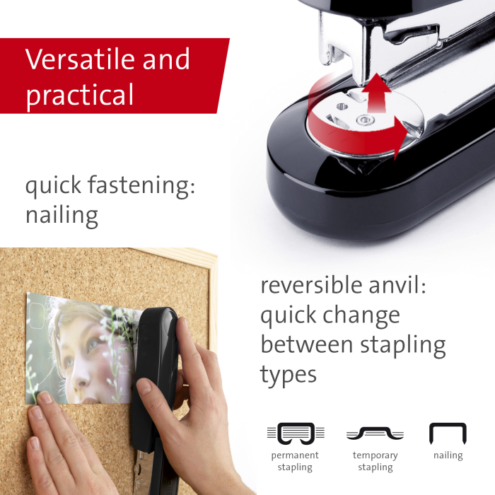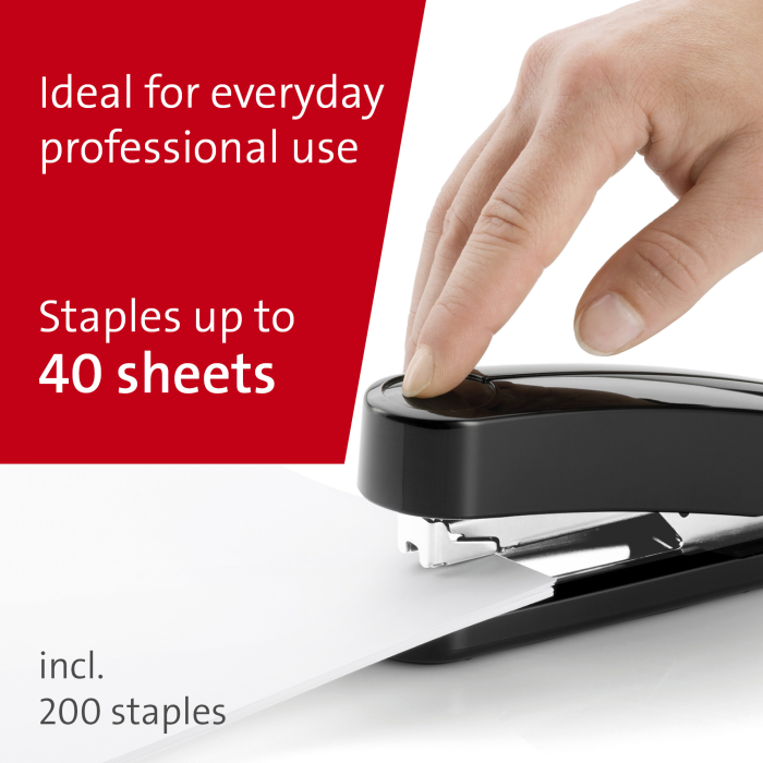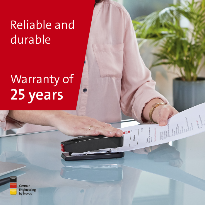 Kompaktná vysokovýkonná zošívačka v kovovom prevedení s plastovým vrchným dielom a dvojitým vedením spiniek. Kapacita náplne 100 spiniek 24/6 - 8 alebo 150 spiniek 26/6 - 8. Hĺbka zošívania 6,5 cm. Hmotnosť 245 g. Záruka 25 rokov.
