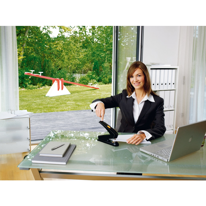 Stolová zošívačka z kolekcie Harmony s vlastnosťou plochého zošívania. Zošívanie so zníženým úsilím, ktoré vyžaduje o 70% menšiu silu ako u bežnej zošívačky pri danej kapacite súčasne zošívaných listov. Výmena spiniek pri striedavom zošívaní veľkého a malého počtu listov nie je nutná-systém ,,bypass` umožní použitie iba jednej veľkosti spiniek tým, že spinku ohne do bokov. Vrchný diel z plastu, kovový zásobník s dvojitým vedením spiniek. Kapacita náplne 150 spiniek 24/8 alebo 200 spiniek 26/8. Hĺbka zošívania 6,5 cm. Hmotnosť 680 g. Záruka 25 rokov.