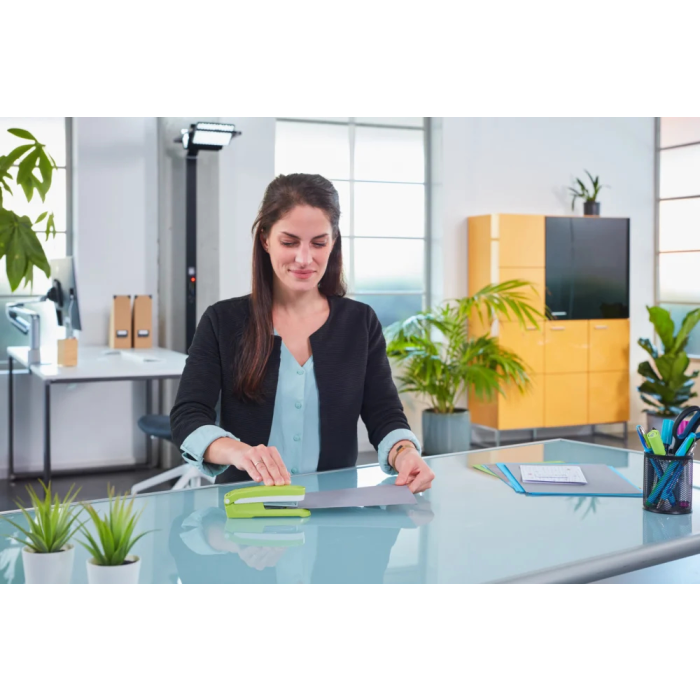 Užitočná celokovová kancelárska zošívačka na každý písací stôl z kolekcie Evolution so stabilnou protišmykovou spodnou časťou. Plastový vrchný diel, integrovaná plastová rozošívačka na zadnej časti, otočná matrica pre otvorený a uzavretý spôsob zošívania. Kapacita náplne 100 spiniek veľkosti 24/6, resp. 150 spiniek veľkosti 26/6. Kapacita zošitia 25 listov papiera. Hĺbka zošívania 5,3 cm. Hmotnosť cca 165 g. Záruka 10 rokov. Farba zelená/sivá.