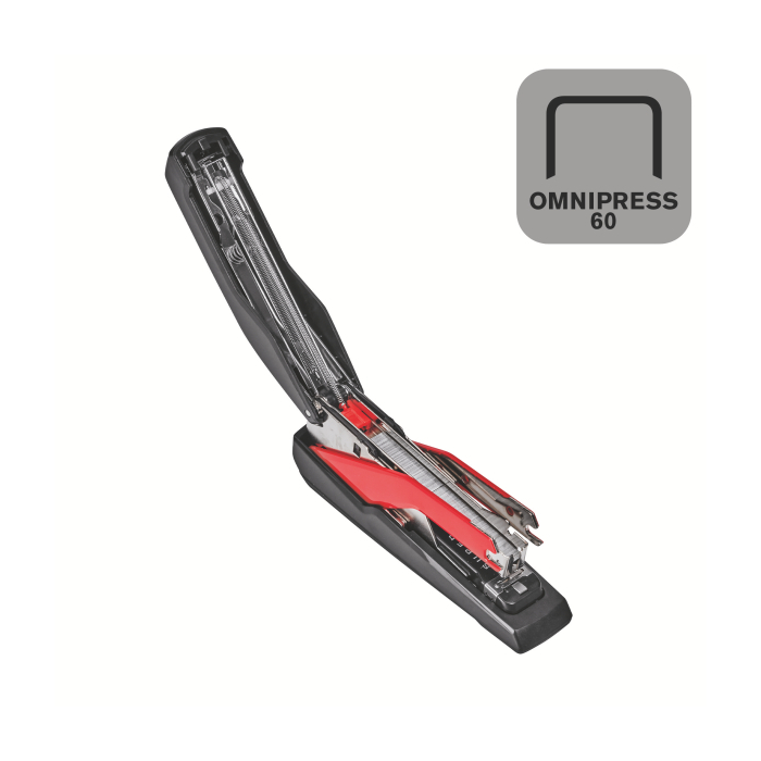 Revolučná zošívačka kompaktných rozmerov a s klasickou kapacitou zásobníka, vybavená patentovanou technológiou Omnipress®, ktorá umožňuje s minimom sily stlačiť zošívačku po celom jej tele a ľahko tak zošiť dokument na stole i v ruke. To všetko v kombinácii s technológiou super plochého zošívania SuperFlatClinch prinášajúcou 40 % úsporu miesta pri zakladaní takto zošitých dokumentov. Farba čierna/červená.